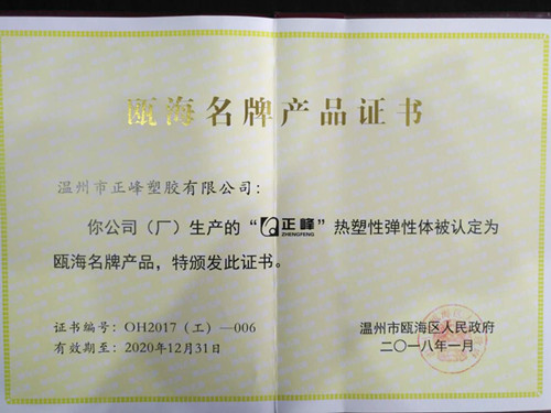 繼 2016年被評(píng)為“國(guó)家高新技術(shù)企業(yè)”后,正峰塑膠再次傳來(lái)喜訊,我公司生產(chǎn)的熱塑性彈性體被甌海區(qū)人民政府授予“甌海名牌產(chǎn)品”稱號(hào),使我公司品牌建設(shè)之路往前邁出了跨越性的一步!